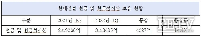 현대건설의 보유현금도 증가했다. 현대건설의 올 1분기 현금 및 현금성자산은 3조3495억원으로 전년 동기(2조9268억원)보다 14.4%(4227억원) 올랐다. 현대건설이 유보금과 현금을 늘리는 것은 불확실성이 증대되는 경영 환경을 대비하기 위한 것으로 풀이된다. 코로나19가 지속되는 상황에서 중대재해처벌법 시행에 따른 안전비용이 증가하는 것은 물론 원자재 가격까지 천정부지로 치솟고 있어서다.
