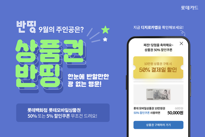 [FETV=장기영 기자] 롯데카드는 ‘디지로카’ 애플리케이션을 통해 롯데 모바일상품권 최대 50% 할인쿠폰을 증정하는 ‘상품권 반띵’ 이벤트를 진행한다고 15일 밝혔다.