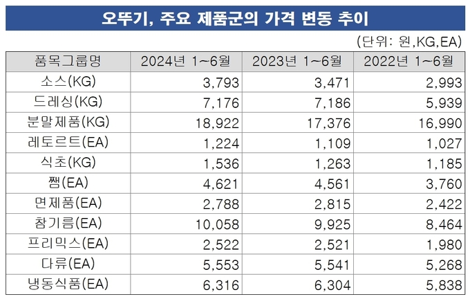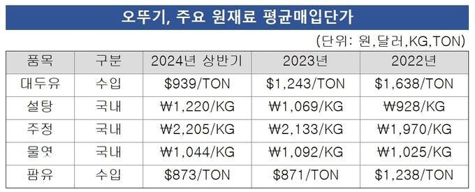 다만 원가 부담을 해소했다고 판단하기는 힘든 것으로 분석된다. 사업보고서에 따르면 대두유(수입)의 경우 톤당 평균매입단가는 2022년 1638달러에서 2023년 1243달러, 2024년 상반기 939달러로 낮아지긴 했지만 국내 원재료는 전반적으로 오르는 추세다.