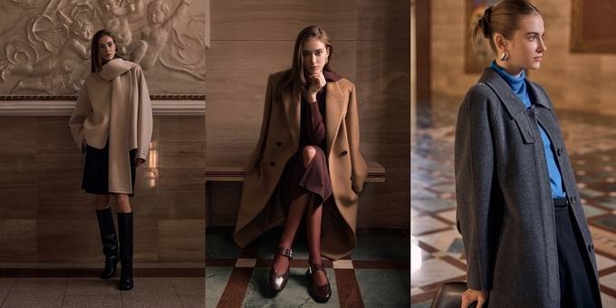 특히, 대표 아이템인 핸드메이드 벨티드 롱 코트는 울 혼방 70%의 고급 소재를 사용해 보온성을 강화했다. 적당한 크기의 스탠카라, 스트레이트 핏, 허리 끈 디테일로 미니멀하면서도 여성스러운 실루엣을 구현했다.