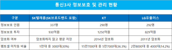 한편 SK텔레콤의 보안에서 가장 문제가 됐던 개인정보 미암호화의 경우 LG유플러스에선 이미 암호화 작업을 진행했다. LG유플러스는 2011년부터 유심인증번호를 암호화하는 작업을 실시했다. KT는 2014년에 암호화를 진행했다.