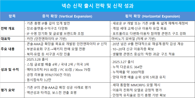 정리하면 종적 확장은 기존 핵심 IP를 세계관·플랫폼·수익 구조 측면에서 ‘깊게 키워 올리는 전략’이며 횡적 확장은 신규·재정비 IP를 중심으로 ‘옆으로 넓혀 가는 전략’이다.