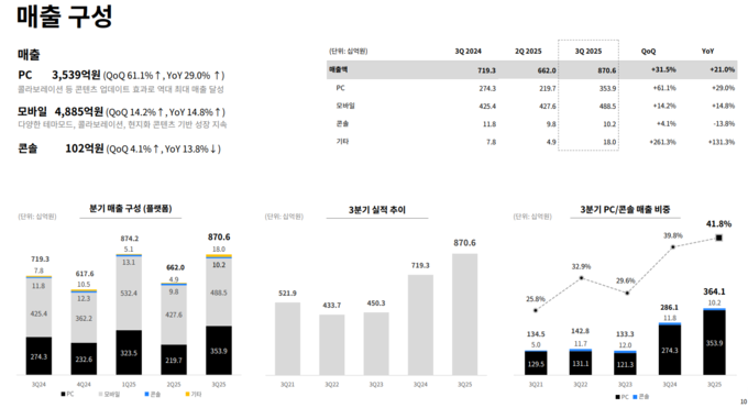 플랫폼별로는 ▲PC 3539억원(전년동기비 +29%, 전분기비 +61%) ▲모바일 4885억원(+15%) ▲콘솔 102억원(-14%) ▲기타 180억원(+131%)을 기록했다.