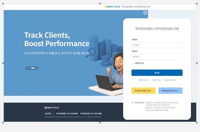 [FETV=이건혁 기자] NH투자증권(대표이사 윤병운, www.nhsec.com)은 투자권유대행인과 퇴직연금모집인의 영업 및 관리 업무 효율화를 위해 전용 홈페이지를 구축하고 1차 서비스를 오픈한다고 15일 밝혔다.