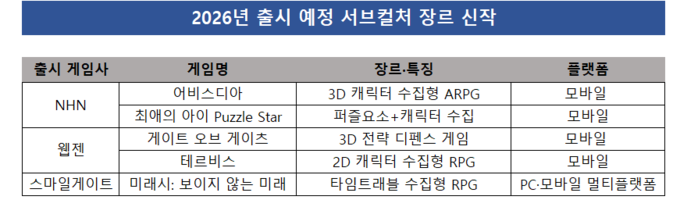 2026년에는 중견 게임사들의 서브컬처 신작 출시가 더욱 본격화될 전망이다. 웹젠은 ‘테르비스’와 ‘게이츠 오브 게이트’ 출시를 예고했다. ‘테르비스’는 재패니메이션풍 캐릭터 수집형 RPG로 전형적인 서브컬처 문법에 각종 기믹 및 협동 요소를 결합했다. ‘게이츠 오브 게이트’는 최대 12인 편성 전투를 특징으로 한 3D 서브컬처 전략 디펜스 게임이다.