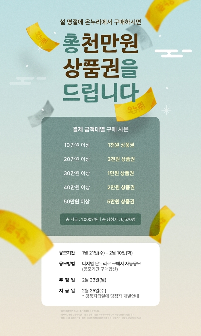 이번 이벤트는 행사 기간 동안 온누리상생스토어에서 디지털 온누리상품권으로 결제하면 자동 응모된다. 누적 구매 금액에 따라 10만 원부터 40만 원까지 구매 금액별로 최대 5만 원 상품권을 받을 수 있다. 당첨자 수는 6570명으로 2월 25일 개별 안내를 통해 확인 가능하다.