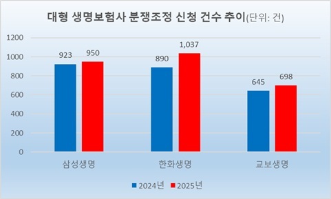 12일 생명보험협회에 따르면 삼성생명, 한화생명, 교보생명 등 3개 대형 생보사의 2025년 분쟁조정 신청 건수(중·반복 제외)는 2685건으로 전년 2458건에 비해 227건(9.2%) 증가했다.
