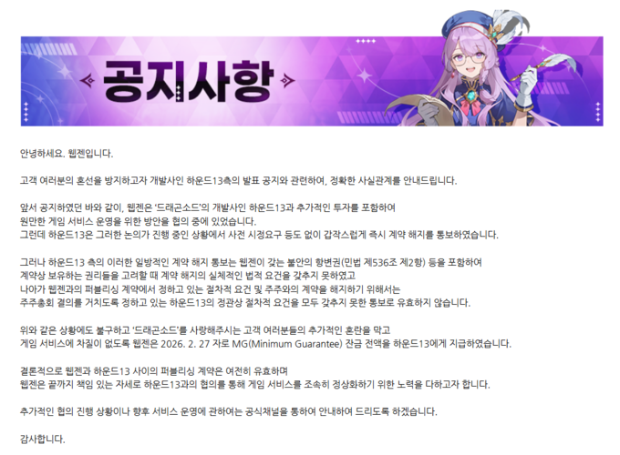 갈등이 수면 위로 드러나자 웹젠은 이용자 보호와 혼란 최소화를 이유로 ‘드래곤소드’ 유료 결제 내역을 전액 환불하고 결제 기능을 중단하겠다고 밝혔다. 출시 한달 만에 서비스 종료 수순에 들어가는 상황이 벌어진 것이다.