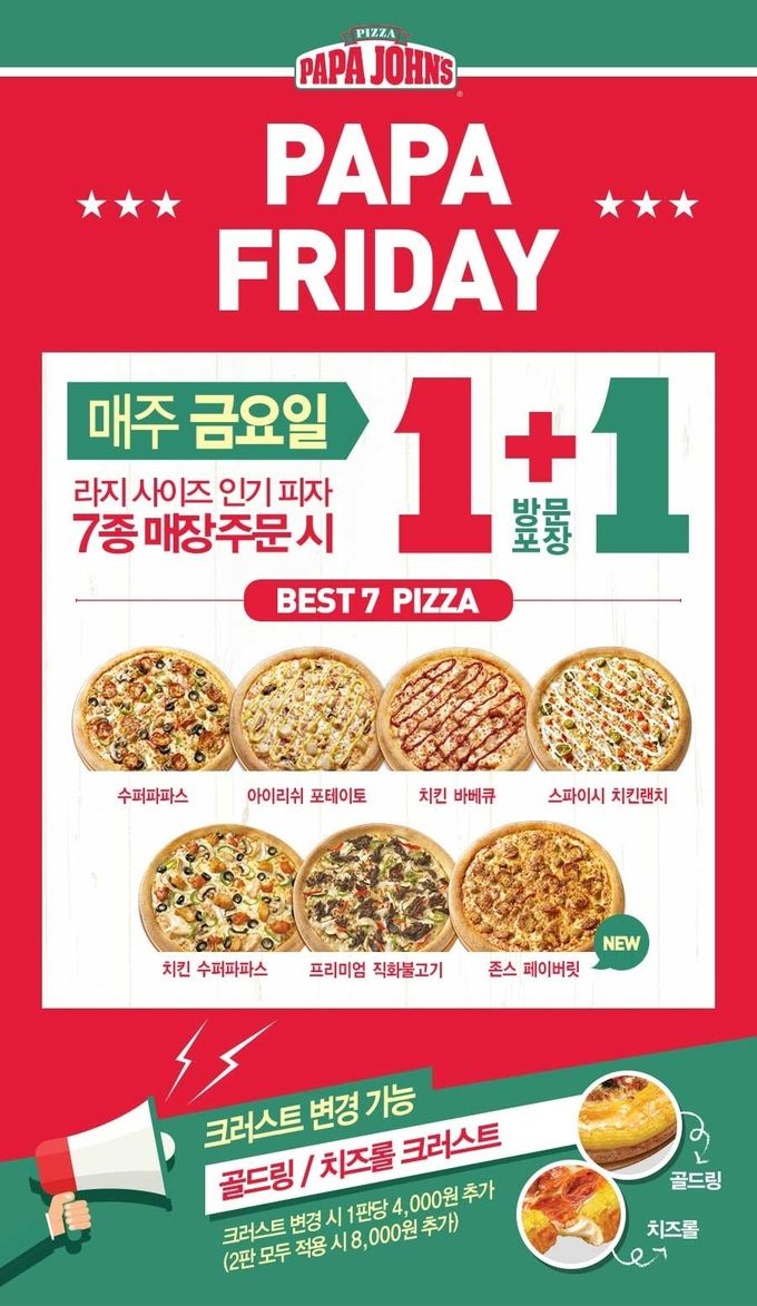 파파존스는 파파 프라이데이 대상 피자를 기존 6종에서 7종으로 늘리는 한편 치즈롤 또는 골드링 크러스트로 도우 변경 시에도 1+1 혜택이 가능해졌다고 14일 밝혔다.