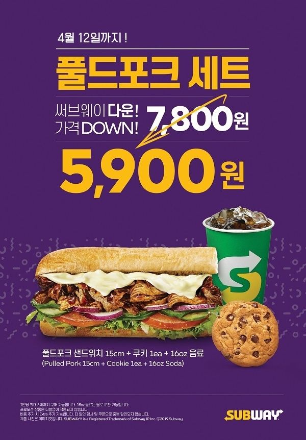 7800원 짜리 풀드포크 세트 메뉴를 단품가 5900원에 제공하는 행사다. 24% 이상 할인된 가격이다. 미군부대 매장을 제외한 전국 343개 써브웨이 매장에서 동시에 진행되며, 1인당 최대 5개까지만 구매할 수 있다. 타 행사 및 쿠폰과 중복 할인이나 더블업 토핑은 적용되지 않는다.