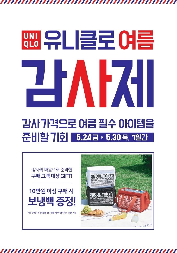 유니클로는 24일부터 ‘여름 감사제’를 통해 땀을 빠르게 흡수하고 말리는 테크놀로지 이너웨어 ‘에어리즘(AIRism)’, 다채로운 색상의 ‘U 크루넥 반팔 티셔츠’, 가볍고 편안한 착용감의 ‘감탄팬츠’, 통기성이 뛰어난 ‘프리미엄 리넨 셔츠’를 포함한 다양한 상품을 특별가에 선보인다. 특히 에어리즘과 U 크루넥 반팔 티셔츠는 이번 시즌 첫 할인이 적용된 가격에 제공될 예정이다. 또 야외 활동이 많아지는 여름철에 유용하게 쓸 수 있는 보냉백을 유니클로 전국 매장과 온라인 스토어에서 10만원 이상 구매하는 고객을 대상으로 선착순 증정한다.