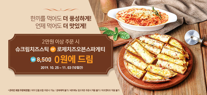 사이드 메뉴 무료 증정은 온라인을 통해 2만원 이상 주문한 고객을 대상으로 진행되며, 결제 시 ‘쿠폰적용’ 항목을 클릭한 후 ‘슈크림치즈스틱’과 ‘로제치즈오븐스파게티’ 중 하나를 선택해 ‘적용가능’을 누르기만 하면 원하는 사이드 메뉴를 무료로 즐길 수 있다.
