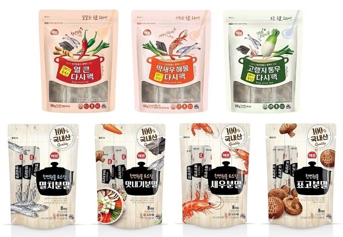 ‘해표 딱새우해물 다시팩’은 딱새우와 멸치, 다시마에 대파를 더해 바다의 풍미 가득한 해산물 맛을 즐길 수 있으며, ‘해표 고랭지통무 다시팩’은 멸치, 다시마, 대파에 강원도 고랭지 통무를 넣어 어떤 요리에도 잘 어울리는 시원한 국물을 우려내는데 제격이다.