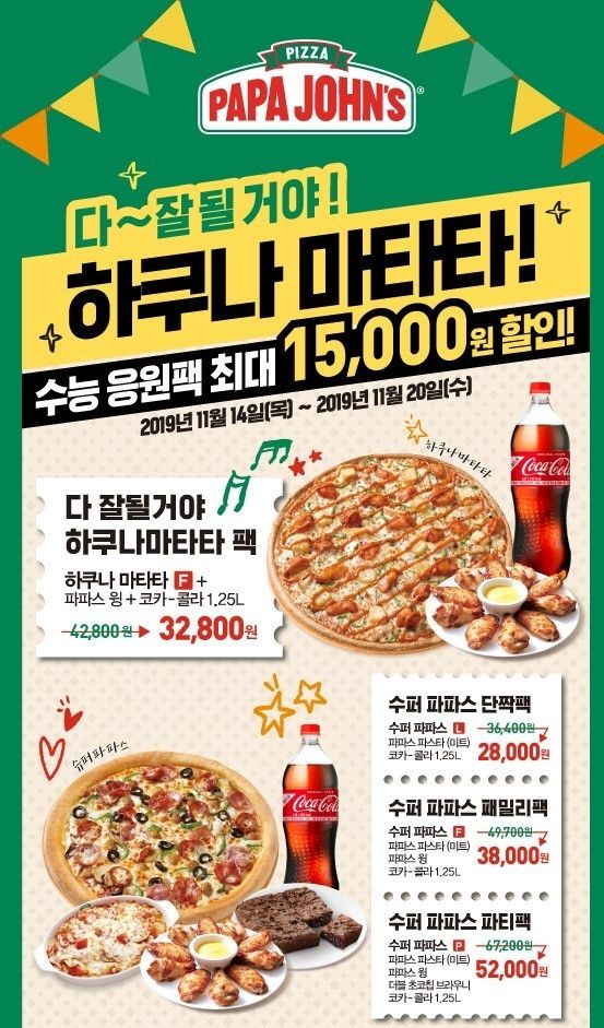 최원제 한국파파존스 마케팅부장은 “모든 수험생들이 그간의 노력에 걸맞은 좋은 성적을 받기를 기원하는 마음으로 이번 수능 프로모션을 준비했다”며 “피자와 사이드 메뉴의 다양한 조합을 맛볼 수 있는 수능 할인 세트를 통해 수험생들이 가족 및 지인들과 편안한 시간을 보내시길 바란다”고 말했다.