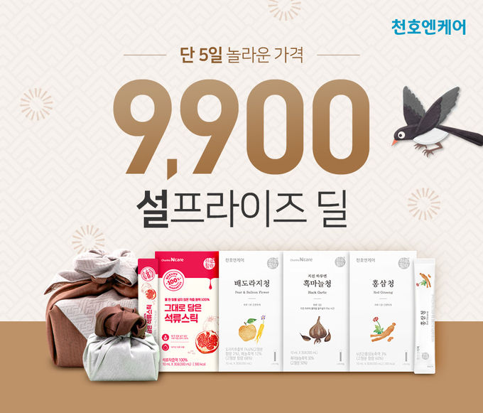 천호엔케어 공식 온라인몰인 천호몰을 통해 1월 15일부터 19일까지 진행되는 이번 특가전은 바쁜 현대인들이 간편하게 건강을 챙길 수 있도록 언제 어디서나 1포씩 먹을 수 있는 스틱형 제품 ‘배도라지청’, ‘지친 하루엔 흑마늘청’, ‘힘내야 할 땐 홍삼청’과 석류만을 착즙한 100% 원액 ‘그대로 담은 석류스틱’으로 구성됐다. 모든 제품은 2박스 이상 구매 시 1박스 당 9,900원에 만나볼 수 있으며, 4박스를 구매할 경우엔 설 맞이 선물로 활용 가능한 쇼핑백을 추가로 증정한다.