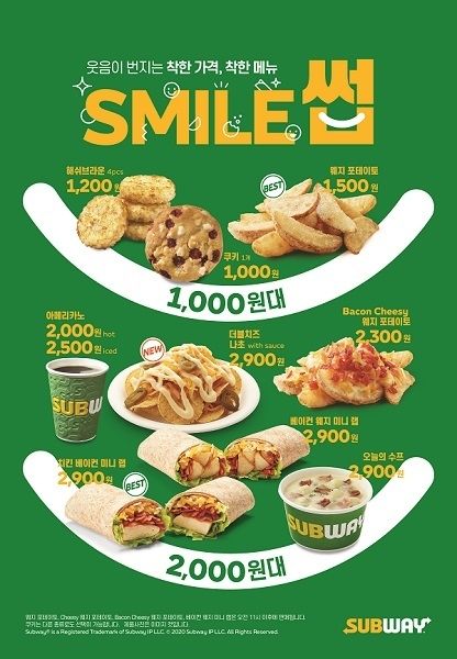 가성비와 가심비를 모두 충족시키는 써브웨이 스마일썹 메뉴는 ▲나초 3종(나초 위드 소스 1500원, 더블치즈 나초 위드 소스 2900원, 살사 더블치즈 나초 3600원), ▲쿠키 5종(더블 초코칩, 초코칩, 오트밀 레이즌, 라즈베리 치즈케익, 화이트 초코 마카다미아 각 1000원), ▲웨지 포테이토 3종(웨지 포테이토 1500원, 치지 웨지 포테이토 2000원, 베이컨 치지 웨지 포테이토 2300원)가 있다 ▲미니 랩 2종(베이컨 웨지 미니 랩, 치킨 베이컨 미니 랩 각 2900원), ▲수프 2종(브로콜리 체다 수프, 베이크 포테이토 수프 각 2900원), ▲해쉬브라운(4조각 1200원) ▲칩(1000원) ▲아메리카노 2종(핫 2000원, 아이스 2500원), ▲탄산음료(1500원) 등 총 20종이다.