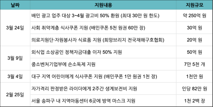 이날 우아한형제들이 내놓은 대책은 △ 업주당 최대 30만 원 한도 내에서 3~4월 광고비·수수료 50% (약 250억원) 환원 △사회 취약계층에 30억 원 규모 식사쿠폰 지원 △의료지원단·자원봉사자 식료품 20억원 어치 지원 등 크게 세 가지다.