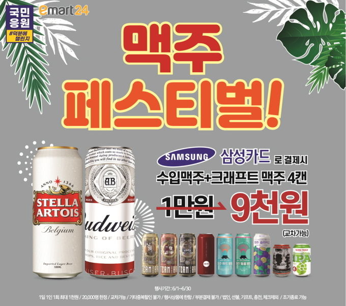 이마트24는 6월 한 달간 지난 해 동월 대비 40% 이상 늘린 100여종 맥주에 대해 4캔 1만원, 5캔 1만원 등 할인 혜택을 제공한다.