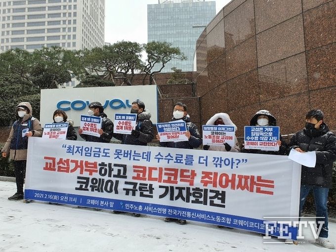 [FETV=김현호 기자] 교섭단체를 거부하고 수수료 삭감을 시도하는 코웨이에 대해 규탄기자회견이 열렸다. 노조 측은 “코웨이가 수수료 삭감을 시도하고 1년 넘게 노동조합 교섭을 외면하고 있다”며 “노동자들이 노동기본권 사각지대에서 심각한 생존의 위협을 받고 있다”고 강조했다.