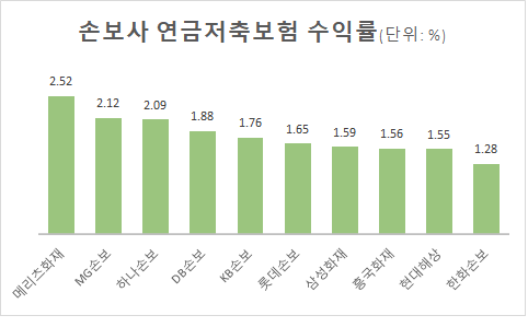 손해보험사도 상황은 크게 다르지 않다. 연금저축보험을 판매한 10개 손보사 가운데 지난해 수익률 2% 이상을 기록한 보험사는 3곳이 전부다. 메리츠화재가 2.52%의 가장 높은 수익률을 냈다. 손보사 2, 3위는 소형사인 MG손해보험과 하나손해보험이 차지했다. MG손보와 하나손보의 지난해 연금저축보험 수익률은 각각 2.12%, 2.09%다.