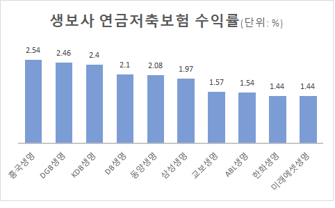 생명보험사의 경우 연금저축보험을 판매한 10개 보험사 가운데 5개 보험사가 지난해 2% 이상의 수익률을 냈다. 흥국생명이 2.54%로 가장 높은 수익률을 기록했으며 DGB생명이 2.46%로 2위에 자리했다. KDB생명(2.4%), DB생명(2.1%), 동양생명(2.08%) 등 다른 중소형사들도 상대적으로 좋은 성적을 냈다.