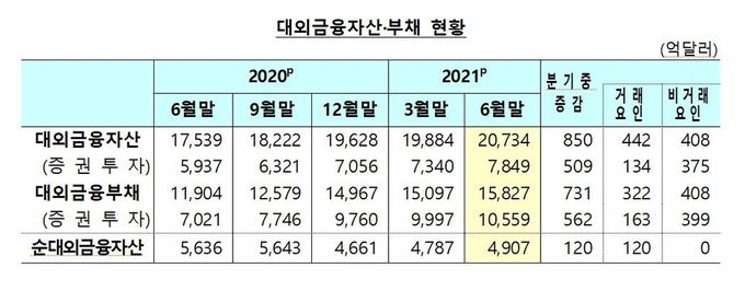 한국은행이 발표한 '2021년 6월말 국제투자대조표(잠정)'에 따르면, 국내 대외금융자산(대외투자)은 지난 3월말보다 850억달러 많은 2조734억달러로 집계됐다. 특히 거주자의 증권투자는 509억달러나 늘었다. 한편 대외금융부채(외국인의 국내투자)는 1조5827억달러로, 역시 비거주자의 증권투자(+562억달러)를 중심으로 731억달러 증가했다. 외국인의 부채성 증권투자가 증가한 데 영향을 받은 것이다.