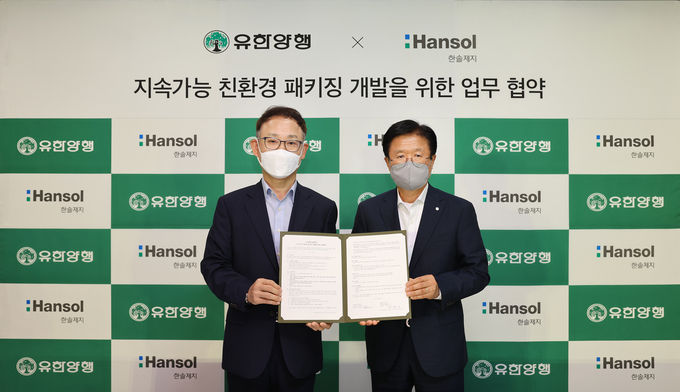 유한양행과 한솔제지는 31일 서울 동작구 유한양행 본사에서 '지속가능한 친환경 패키징 개발을 위한 업무협약'을 체결했다. 이날 협약식에는 조욱제 유한양행 대표와 한철규 한솔제지 대표이사 등 양사 임직원들이 참석했다.