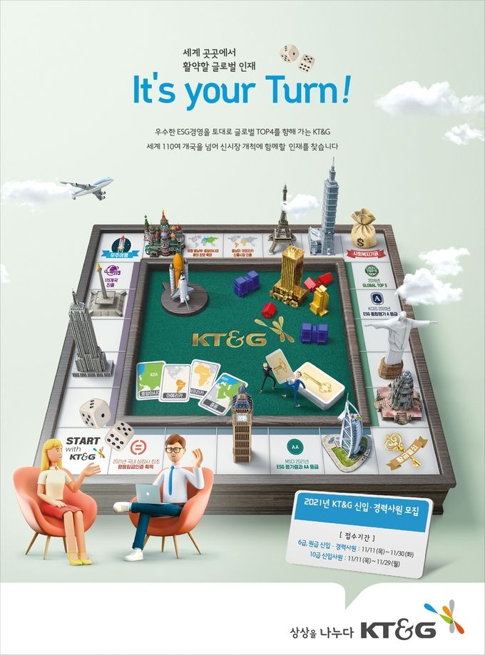 KT&G 관계자는 “KT&G를 함께 이끌어 갈 도전적이고, 열정적인 인재들이 많이 지원하기를 기대한다”며 “앞으로도 지속적인 고용 창출을 통해 국가 경제에 기여하고자 노력할 것”이라고 전했다.