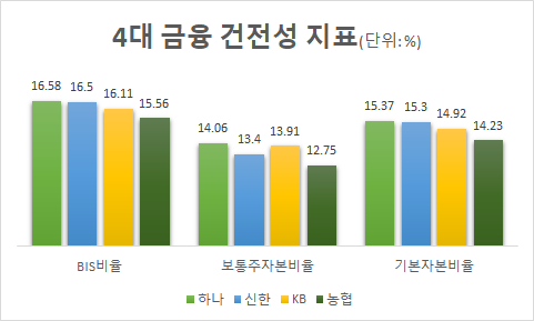 농협금융은 또 다른 건전성 지표인 보통주자본비율(CET1)과 기본자본비율(Tier1)에서도 최하위를 기록했다. 농협금융의 올 9월 말 보통주자본비율과 기본자본비율은 12.75%, 14.23%로 4대 금융의 평균에 한참 못미친다. 이들 4곳의 평균은 각각 13.53%, 14.96%이다.