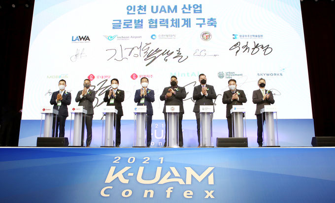 롯데지주와 롯데렌탈은 미국 스카이웍스 에어로노틱스, 모비우스에너, 인천광역시 등 7자 업무협력을 통해 2022년부터 도심항공교통 실증 비행을 추진하기로 했다. 인천광역시가 영종도 파라다이스호텔에서 16일부터 이틀간 개최하는 ‘2021 K-UAM Confex’ 첫날 오전, 인천 도심항공교통 실증비행 협약식을 진행했다.