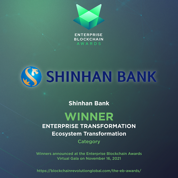 신한은행이 수상한 에코시스템 혁신 대상은 분산원장, 스마트 컨트랙트, 디지털 자산 등 블록체인 기술을 기업 업무 및 인프라에 적용해 블록체인 생태계에 이바지한 글로벌 기업에 주는 상이다.