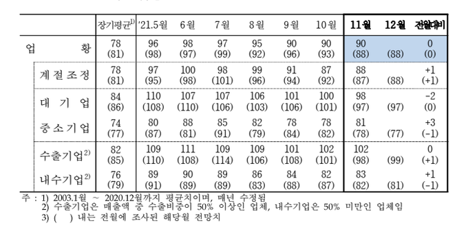 업종별로는 제조업 업황 BSI가 90으로 전월과 동일했다. 3개월 연속 동일한 수준으로, 지난 8월(95) 이후 최고치다. 반도체 관련 부품 수요 증가와 해외공장 가동 정상화에 따른 영향으로 전자·영상·통신장비가 3포인트(p) 상승했다. 반면 1차 금속가공과 화학물질·제품은 각각 5p, 4p 하락했다. 1차 금속가공은 전방산업 수요 둔화와 자동차 업종의 공급 차질이 영향을 미쳤다.