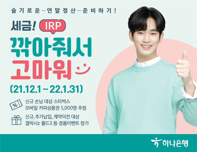 [FETV=권지현 기자] 하나은행이 다음 달 1일부터 연말정산 시즌 세액공제를 위해 개인형 퇴직연금(IRP) 신규 및 추가납입을 하는 고객을 대상으로 'IRP! 세금! 깎아줘서 고마워' 이벤트를 실시한다고 30일 밝혔다.