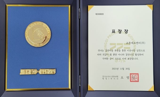 교촌은 경기도 지역 내 아동 후원과 나눔 문화 확산 등 결연 사업 활성화에 기여한 공을 인정받아 이번 경기도지사 표창을 받았다. 2002년부터 지난 20년 간, 교촌은 초록우산 어린이재단과 아동들의 행복한 삶과 올바른 성장을 위한 다양한 후원 사업을 통해 경기도 지역 내 아동들이 안정적으로 삶의 기반을 마련할 수 있도록 힘을 보탰다.