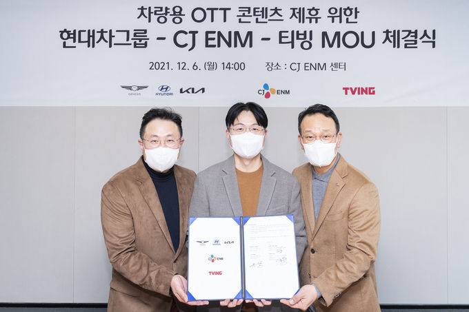 이를 위해 양사는 서울 마포구 상암동 CJ ENM센터에서 임상엽 CJ ENM 경영지원총괄, 이명한 티빙 공동대표, 추교웅 현대자동차그룹 전무 등이 참석한 가운데 양해각서를 체결했다.