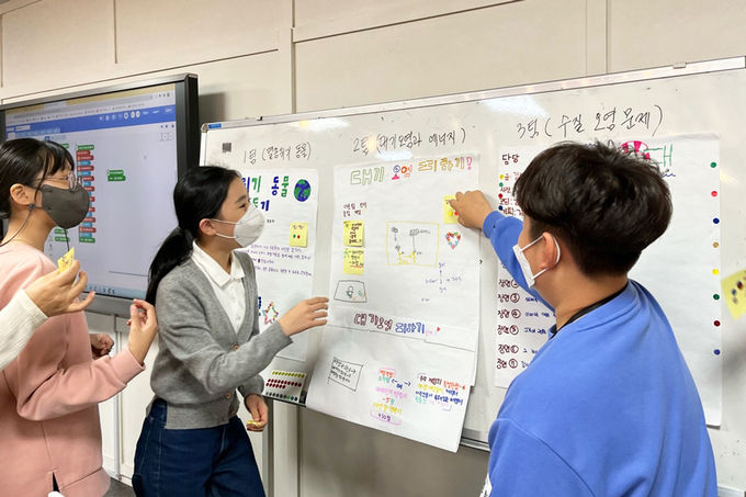 먼저, 판교의 코딩공작소에서는 '인공지능(AI)으로 미리 보는 세상'을 주제로 한 활동이 이루어졌다. 메타버스와 엔트리 블록코딩을 이용해 환경 문제를 인식하는 온라인 수업과 조를 구성해 문제해결에 필요한 결과물을 만드는 오프라인 수업이 병행됐다.