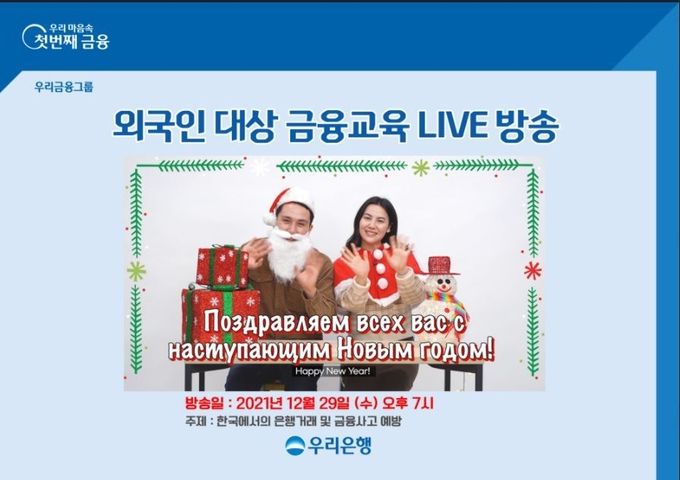우리은행은 한국의 금융문화가 낯설고 은행 업무가 익숙치 않은 외국인 고객에게 모국어로 비대면 금융교육 방송을 실시해 이들의 금융 접근성을 높여주고자 본 프로그램을 기획했다. 이번 방송은 러시아어편으로 우리은행에 근무 중인 카자흐스탄 국적의 직원이 ▲은행 이용 방법 ▲계좌개설 및 해외송금 ▲보이스피싱 등 금융사고 예방법을 유튜브 라이브로 강의한다.