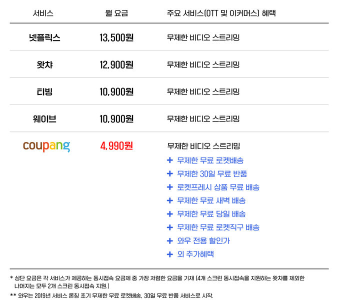 쿠팡은 지난 2019년 와우 멤버십을 론칭 한 이후 지속적인 투자를 통해 멤버십 혜택을 꾸준히 늘려왔다. 무료 배송과 무료 반품에만 수조원을 투자했으며, 이를 통해 멤버십 론칭 후 고객들에게 전달된 무료배송 주문 건수만 10억건이 넘는다. 국내 배송 문화를 바꾼 로켓배송 무제한 무료배송/무료 반품서비스 외에도 로켓프레시 새벽배송, 로켓직구 무료배송, 와우 전용 할인 등 10개 혜택이 추가됐다.