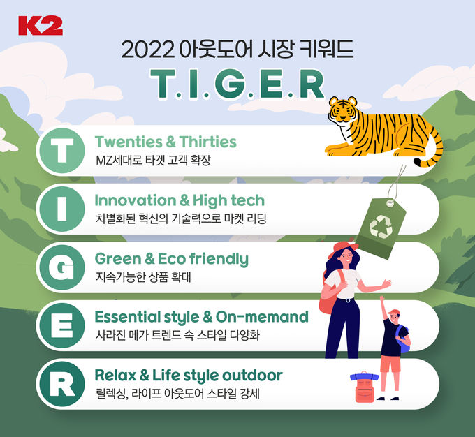 K2가 제시하는 ‘타이거’는 ▲MZ세대로 타겟 고객 확장(Twenties&Thirties) ▲차별화된 혁신의 기술력으로 마켓 리딩(Innovation&High tech) ▲지속가능한 상품 확대(Green & Eco friendly) ▲사라진 메가 트렌드 속 스타일 다양화(Essential style & On-memand) ▲릴렉싱, 라이프 아웃도어 스타일 강세(Relax & Life style outdoor)를 의미한다.
