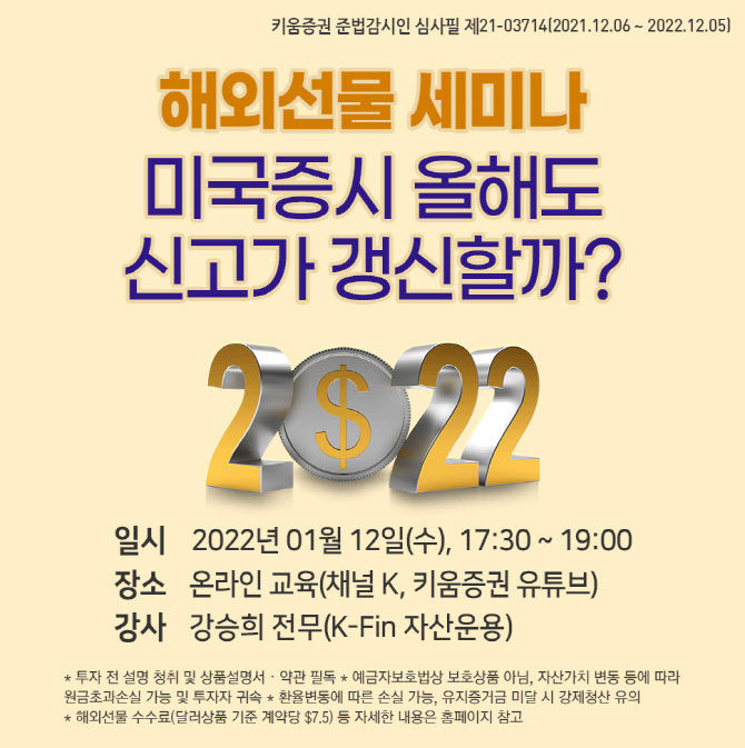 [FETV=성우창 기자] 키움증권은 오는 12일 17시30분부터 90분간 '2022년 해외선물 전망 세미나'를 개최한다고 5일 밝혔다.