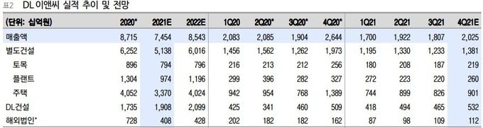 2020년 각 부문별 매출은 토목이 8960억원, 플랜트 1조3040억원, 주택 4조520억원, DL건설 1조7350억원, 해외법인 7280억원이다. DL건설을 제외한 모든 분야에서 부진을 면치 못할 것으로 관측된다. 이베스트투자증권은 DL건설 2021년 매출액이 2020년 때 보다 1730억원 늘어날 것으로 보았다.