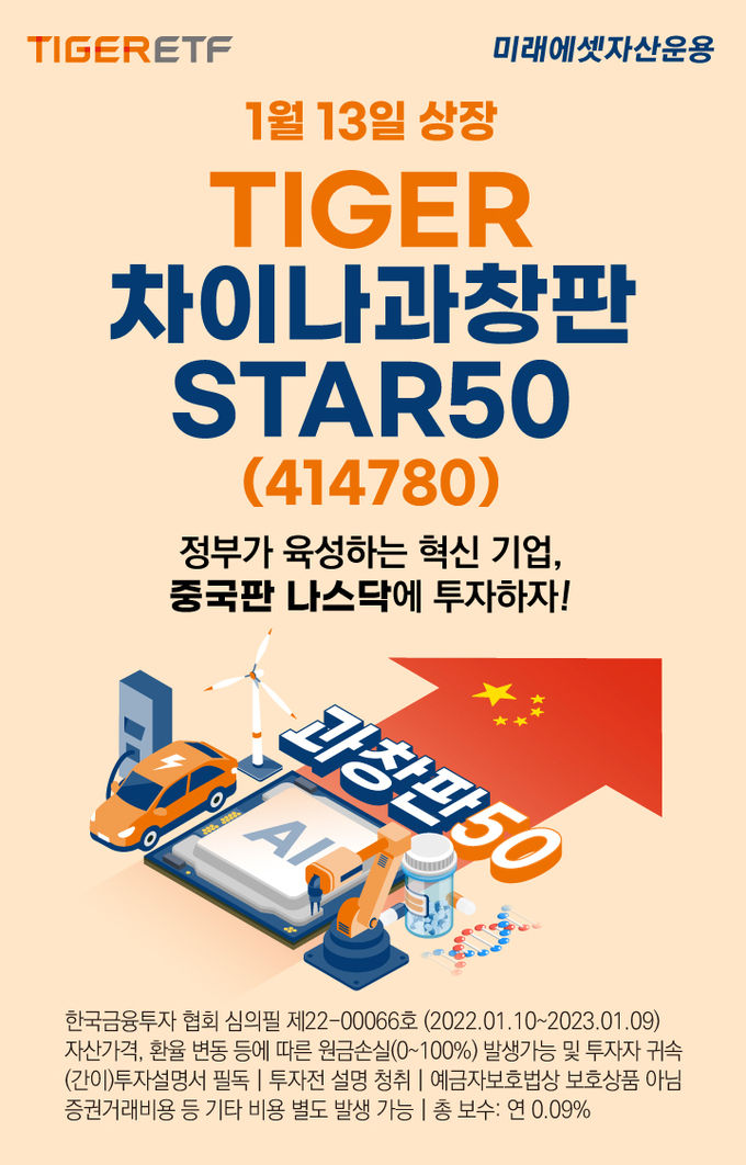 [FETV=성우창 기자] 미래에셋자산운용은 신규 상장하는 ‘TIGER 차이나과창판STAR50 상장지수펀드(ETF)’ 거래고객을 대상으로 이벤트를 진행한다고 13일 밝혔다.