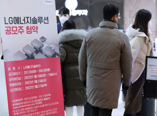 앞서 지난 11~12일 기관투자자들을 대상으로 진행된 LG에너지솔루션 수요예측에는 국내외 기관 1988곳이 참여해 2023대 1의 경쟁률을 기록했다. 전체 주문 규모는 1경5203조원으로 국내 주식시장 역사상 처음으로 1경원을 넘었다. 공모가는 최상단인 30만원으로 결정됐다.
