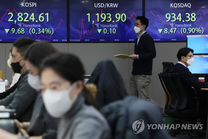 24일 한국거래소에 따르면 코스피는 전장보다 42.29포인트(1.49%) 하락한 2792.00에 거래를 마쳤다. 종가 기준 2700선에 장을 마감한 것은 지난 2020년 12월 23일(2759.82) 이후 처음이다. 개인과 외국인이 각각 1370억원과 4356억원어치의 주식을 순매도했지만, 기관은 5929억원을 순매수했다.