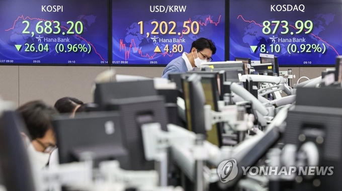 27일 한국거래소에 따르면 코스피 지수는 전날보다 94.75포인트(3.50%) 하락한 2614.49에 거래를 마쳤다. 코스피가 2600선에 마감한 것은 지난 2020년 12월 3일 이후 처음이며, 14개월만에 최저치를 기록했다. 기관이 홀로 1조8060억원을 사들였지만, 개인과 외국인이 각각 1719억원, 1조6296억원을 팔아치웠다.