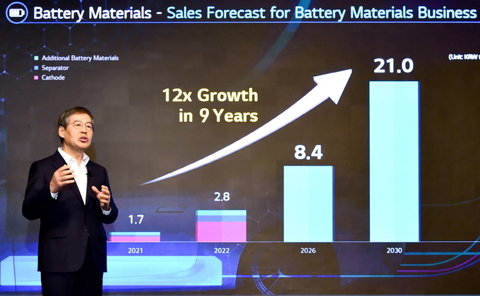 LG화학은 전지소재 사업을 2021년 매출 1.7조에서 2030년 21조로 12배 이상 성장시키고, 두 자릿수의 영업이익률을 창출하는 고수익 사업으로 육성해 나갈 방침이다. 자회사 LG에너지솔루션의 성장과 외부 고객사 확보가 가시화 되면 매출 목표는 이보다 더 높아질 것으로 예상된다.