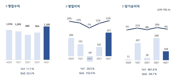 펄어비스의 4분기 매출은 1180억원, 영업이익 257억원, 당기순이익 108억원을 기록했다. ‘검은사막'과 '이브'의 견고한 글로벌 성과 및 투자로 전분기 대비 매출과 영업이익이 각각 22.4%, 152%, 전년 동기대비 11.7%, 28.5% 증가했다. 2021년 연간 매출은 4038억원, 영업이익 430억원, 당기순이익 611억을 달성했다.