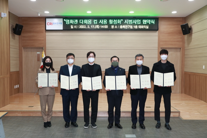 [FETV=김수식 기자] 롯데시네마는 지난 17일 충북연구원에서 6개 기관과 함께 다회용 컵 사용 활성화를 위한 영화관 1회용 컵 줄이기 시범사업의 업무협약을 체결했다고 18일 밝혔다. 협약식에는 김재철 롯데컬처웍스 영업부문장, 김연준 충청북도 환경산림국장, 박노준 뽀득 대표이사 등이 참석했다.