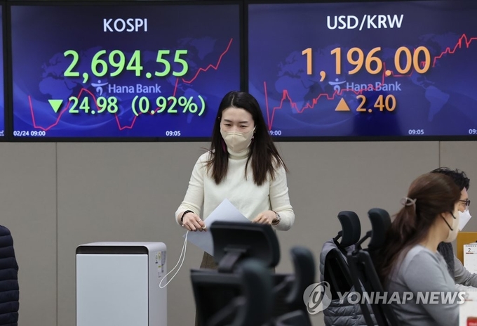 [FETV=성우창 기자] 우크라이나에서 포화 소리가 울리자 코스피 2700대 방어선이 뚫린 채 하락 마감했다. 뉴욕 및 주요 아시아 증시도 약세를 보였지만, 달러 환율과 유가·금·농산물 가격은 치솟았다.