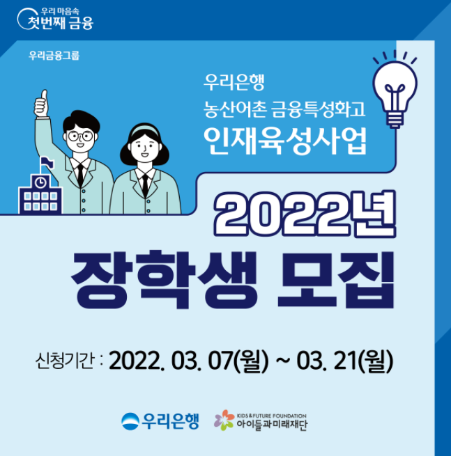 이번 사업은 미래세대 육성을 위한 사회공헌 사업의 일환으로 비교적 취업 및 진로 교육의 기회가 적은 농산어촌 소재 금융특성화고 학생들의 경쟁력 강화를 돕고자 기획됐다. 우리은행은 사회복지법인 ‘아이들과미래재단’과 함께 선발 학생들의 금융권 취업과 진학 역량 강화를 위한 금융 자격증 취득 비용을 지원한다.